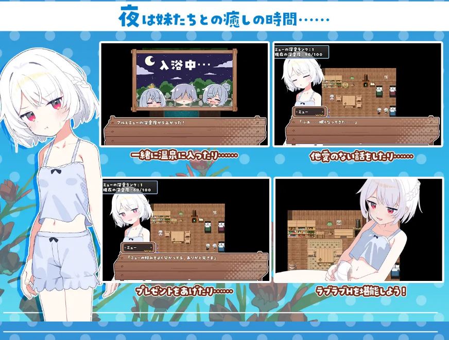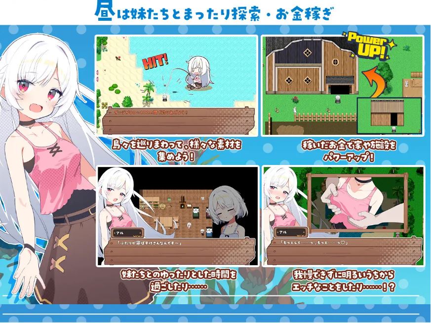 冒险与亲密互动皆随你心意。在自由生活中加深与妹妹们的羁绊,逐步扩建据点并前往新岛屿,正是本作的主题。